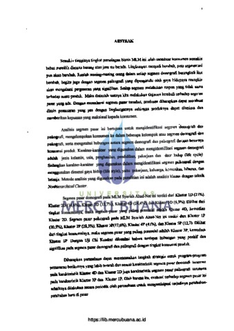 Semakin tingginya tingkat persaingan bisnis MLM ini telah membuat konsumen semakin bebas memilih dimana barang atau jasa itu berada. Lingkungan menjadi berubah, peta segmentasi pun akan berubah. Jumlah masing-masing orang dalam setiap segmen demografi barangkali ikut berubah, begitu juga dengan segmen psikografi yang dipengaruhi oleh gaya hidupnya mungkin akan mengalami pergeseran yang signifikan. Setiap segmen melakukan respon yang tidak sama terhadap suatu produk. Maka disinilah saatnya kita melakukan tinjauan kembali terhadap segmen pasar yang ada. Dengan memahami segmen pasar tersebut, produsen diharapkan dapat membuat disain pemasaran yang pas dengan lingkungannya sehingga produknya dapat diterima dan memberikan kepuasan yang maksimal kepada konsumen. Analisis segmen pasar ini bertujuan untuk mengidentifikasi segmen demografi dan psikografi, mengelompokan konsumen ke dalam beberapa kelompok atau segmen demografi dan psikografi, serta mengetahui hubungan antara segmen demografi dan psikografi dengan besarnya konsumsi produk. Karakter-karakter yang digunakan dalam mengidentifikasi segmen demografi adalah jenis kelamin, usia, penghasilan, pendidikan, pekerjaan dan daur hidup (life cycle). Sedangkan karakter-karakter yang digunakan dalam mengidentifikasi segmen psikografi dengan menggunakan dimensi gaya hidup (life style), yaitu pekerjaan, keluarga, komunitas, hiburan, dan belanja. Metode analisis yang digunakan pada penelitian ini adalah analisis klaster dengan teknik Nonhierarchical Cluster. UNIV had-Net ini t terdiri dari Klaster ID (21%), Klaster 2D (14,6%), Klaster 3D (33,7%), Klaster 4D (24,4%), dan Klaster SD (6,3%). Dilihat dari tingkat konsumsinya, maka segmen pasar yang paling potensial adalah Klaster 4D, kemudian Klaster 2D. Segmen pasar psikografi pada MLM Syariah Ahad-Net ini terdiri dari Klaster 1P (20,5%), Klaster 2P (28,3%), Klaster 3P(17,6%), Klaster 4P (41%), dan Klaster 5P (12,7). Dilihat dari tingkat konsumsinya, maka segmen pasar yang paling potensial adalah Klaster 3P, kemudian Klaster IP. Dengan Uji Chi Kuadrat diketahui bahwa terdapat hubungan yang positif dan signifikan pada segmen pasar demografi dan psikografi dengan tingkat konsumsi produk. Segmen pasar demografi pada MLM Syariah Ahad-Net ini MERCO BIANA Diharapkan perusahaan dapat merencanakan langkah strategis untuk program-program pemasaran berikutnya yang lebih terarah dan sesuai karakteristik segmen pasar demorafi terutama pada karakteristik Klaster 4D dan Klaster 2D juga karakteristik segmen pasar psikografi terutama pada karakteristik Klaster 3P dan Klaster IP. Oleh karena itu, evaluasi terhadap segmen pasar ini sebaiknya dilakukan secara periodik oleh perusahaan untuk mengantisipasi terjadinya perubahan-perubahan baru di pasar.