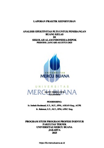 FERIYANTO, DAFIT (2025) ANALISIS EFEKTIVITAS PLTS UNTUK PENERANGAN RUANG KELAS DI SEKOLAH ALAM INDONESIA-DEPOK PERIODE: JANUARI-AGUSTUS 2025. S1 thesis, Universitas Mercu Buana Jakarta.
