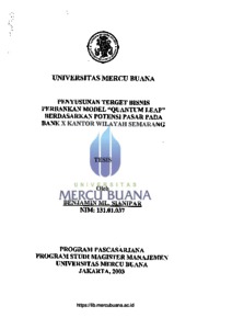 SIANIPAR, BENJAMIN, Penyusunan Target Bisnis Perbankan Model "Quantum Leap" berdasarkan potensi pasar pada Bank X Kantor Wilayah Semarang, dibawah bimbingan Bpk. Handry sebagai ketua, dan Bpk Faisal sebagai anggota. Kondisi ekonomi makro Indonesia di tahun 2003 diperkirakan tidak akan jauh berbeda dengan tahun 2002 yang diwarnai oleh berbagai kondisi yang kurang menguntungkan. Antara lain, daya beli masyarakat yang lemah seiring dengan naiknya harga BBM, tarif dasar listrik dan telepon. Juga pertumbuhan ekonomi yang tertekan oleh peristiwa luar negeri seperti perang Irak. Selain itu, perbankan nasional masih harus menghadapi kendala, baik yang bersifat internal maupun eksternal. Kendala yang dihadapi Perbankan pada tahun 2002, diperkirakan masih belum dapat diatasi sepenuhnya pada tahun 2003, karena faktor lingkungan ekonomi, sosial-politik, keamanan dan hukum relatif belum banyak berubah. Dengan memperhatikan hal-hal tersebut di atas, tampaknya perbankan nasional pada tahun 2003 diperkirakan akan menghadapi pilil än an pasar yang semakin terbatas sebagai akibat bisnis yang berskala menengah-besar tampaknya masih "tidur". Dalam kondisi ekonomi seperti itu, sebagian besar bank-bank nasional diperkirakan secara sadar akan mengubah strateginya untuk lebih memfokuskan pembiayaan pada UKM khususnya segmen bisnis ritel dan konsumen. Hal ini menuntut Bank X untuk meningkatkan kualitas dan kapabilitas Kantor Wilayah dalam mengembangkan bisnis di daerahnya sesuai dengan karakter dan potensinya masing-masing, terutama karena dampak yang disebabkan oleh implementasi otonomi daerah. Agar tetap bertahan (survive) dan bisa bersaing, Bank X harus mengerahkan segala daya dan upaya. Krisis yang terjadi sangat besar dan belum juga terlihat ujung penyelesaiannya. Agar survive Bank X mengimplementasikan program quantum leap. Quantum Leap adalah target yang ditetapkan berdasarkan pertumbuhan bisnis agresif yang ingin dicapai oleh wilavah, dengan ciri pertumbuhan di atas dan melebihi pertumbuhan pasar dan pertumbuhan normal Bank X selama ini, ambisi wilayah untuk merebut/menjaring pasar, dicapai melalui implementasi inisiatif strategi, lebih meningkatkan market share Bank X dengan expected market share minimal 20% yang akan dicapai secara bertahap hingga tahun 2006, dengan asumsi bahwa Bank X adalah 5 bank besar. Dalam segmen ritail, tidak ayal lagi Bank Central Asia (BCA) merupakan rajanya. Untuk menyebut bank lain yang merupakan pesaing utama agaknya cukup banyak, sebut saja, Bank Mandiri, BRI, Danamon. Pesaing berikutnya yang patut diperhitungkan adalah Bank Permata yang merupakan hasil merger lima bank: Bank Bali, Bank Universal, Bank Patriot, Bank Prima Ekspres dan Bank Artha Media. Persaingan perbankan nasional di sektor ini sungguh ketat, licin dan berliku. Pada kesempatan ini penulis mencoba menganalisis penyusunan target Quantum Leap yang dilakukan Bank X Kantor Wilayah Semarang yang memiliki daerah kerja (pasar) mencakup Propinsi Jawa Tengah dan DIY. Analisa dilakukan mulai dari menganalisa pasar, posisi persaingan hingga perumusan strategi untuk mencapai target bisnis. Karena keterbatasan waktu maka penelitian hanya dilakukan berdasarkan data deskriptif yang diperoleh dari kantor wilayah Bank X,Semarang dan data pesaing. Data untuk mengetahui potensi daerah setempat diperoleh dari instansi terkait seperti BPS, BI, dan PemR CU BUANA Pada akhirnya menulis melakukan tinjauan kritis atas model Quantum Leap Bank X Kantor Wilayah Semarang, termasuk metodologi proyeksi yang digunakan serta membuat kesimpulan dan memberikan saran yang relevan pada manajemen Bank X.