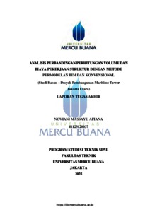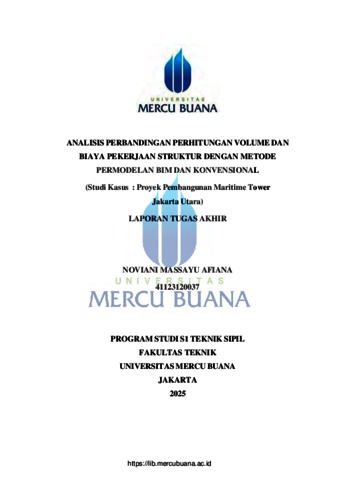 AFIANA, NOVIANI MASSAYU (2025) ANALISIS PERBANDINGAN PERHITUNGAN VOLUME DAN BIAYA PEKERJAAN STRUKTUR DENGAN METODE PERMODELAN BIM DAN KONVENSIONAL (Studi Kasus : Proyek Pembangunan Maritime Tower Jakarta Utara). S1 thesis, Universitas Mercu Buana Jakarta.