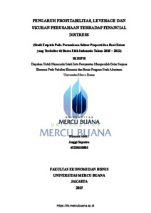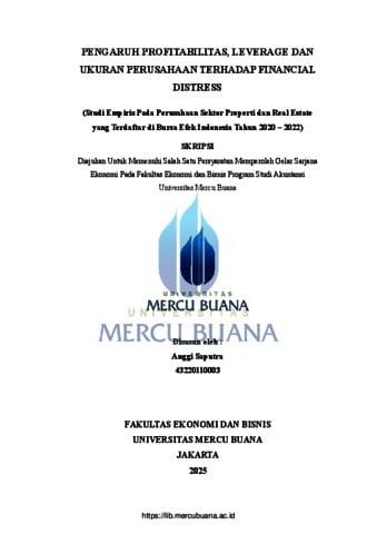SAPUTRA, ANGGI (2025) PENGARUH PROFITABILITAS, LEVERAGE DAN UKURAN PERUSAHAAN TERHADAP FINANCIAL DISTRESS (Studi Empiris Pada Perusahaan Sektor Properti dan Real Estate yang Terdaftar di Bursa Efek Indonesia Tahun 2020 - 2022). S1 thesis, Universitas Mercu Buana Jakarta.