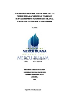 ANGGREANI, SHELVYA (2025) PENGARUH CITRA MEREK, HARGA, DAN KUALITAS PRODUK TERHADAP KEPUTUSAN PEMBELIAN SKINCARE SKINTIFIC PADA GENERASI MILENIAL PENGGUNA MARKETPLACE DI JABODETABEK. S1 thesis, Universitas Mercu Buana Jakarta.