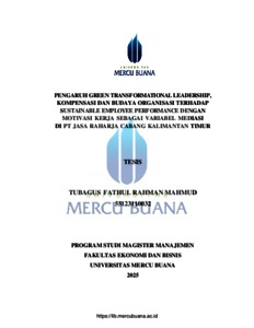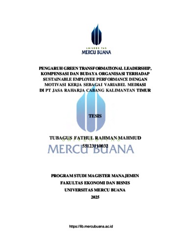 MAHMUD, TUBAGUS FATHUL RAHMAN (2025) PENGARUH GREEN TRANSFORMATIONAL LEADERSHIP, KOMPENSASI DAN BUDAYA ORGANISASI TERHADAP SUSTAINABLE EMPLOYEE PERFORMANCE DENGAN MOTIVASI KERJA SEBAGAI VARIABEL MEDIASI DI PT JASA RAHARJA CABANG KALIMANTAN TIMUR. S2 thesis, Universitas Mercu Buana Jakarta.