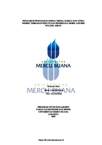 DWIHARTA, ERJA (2025) PENGARUH PEMASARAN SOSIAL MEDIA, HARGA DAN CITRA MEREK TERHADAP KEPUTUSAN PEMBELIAN MOBIL LISTRIK WULING AIR EV. S1 thesis, Universitas Mercu Buana Jakarta.