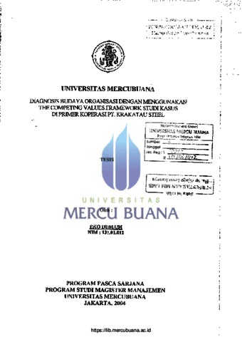 DUMADI, EKO (2004) DIAGNOSIS BUDAYA ORGANISASI DENGAN MENGGUNAKAN THE COMPETING VALUES FRAMEWORK STUDI KASUS DI PRIMER KOPERASI PT. KRAKATAU STEEL. S2 thesis, Universitas Mercu Buana Jakarta.