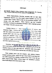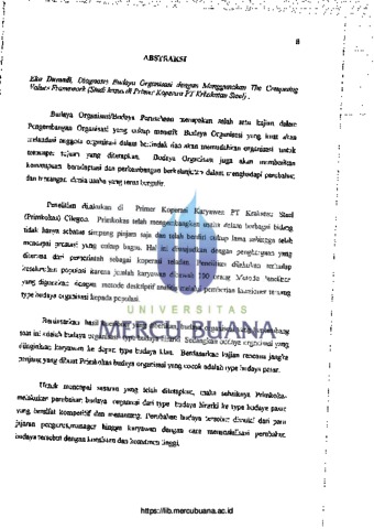 ABSTRAKSI Eko Dumadi, Diagnosis Budaya Organisasi dengan Menggunakan The Competing Values Framework (Studi kasus di Primer Koperasi PT Krkakatau Steel), Budaya Organisasi/Budaya Perusahaan merupakan salah satu kajian dalam Pengembangan Organisasi yang cukup menarik. Budaya Organisasi yang kuat akan melandasi anggota organisasi dalam bertindak dan akan memudahkan organisasi untuk mencapai tujuan yang ditetapkan. Budaya Organisasi juga akan memberikan kemampuan beradaptasi dan perkembangan berkelanjutan dalam menghadapi perubahan dan tantangan dunia usaha yang terus bergulir. Penelitian dilakukan di Primer Koperasi Karyawan PT Krakatau Steel (Primkokas) Cilegon. Primkokas telah mengembangkan usaha dalam berbagai bidang tidak hanya sebatas simpang pinjam saja dan telah berdiri cukup lama sehingga telah mencapai prestasi yang cukup bagus. Hal ini diwujudkan dengan penghargaan yang diterima dari pemerintah sebagai koperasi teladan. Penelitian dilakukan terhadap keseluruhan populasi karena jumlah karyawan dibawah 100 orang. Metode Penelitian yang digunakan dengan metode deskriptif analitis melalui pemberian kuesioner tentang type budaya organisasi kepada populasi. UNIVERSITAS Berdasarkan hasil kuesioner seat ini adalah budaya saat ini adalah budaya organisasi type budaya hirarki. Sedangkan budaya organisasi yang diinginklan karyawan ke depan type budaya klan. Berdasarkan kajian rencana jangka panjang yang dibuat Primkokas budaya organisasi yang cocok adalah type budaya pasar. diberikan, budaya organisasi yang berkembang Untuk mencapai sasaran yang telah ditetapkan, maka sebaiknya Primkokas melakukan perubahan budaya organiasi dari type budaya hirarki ke type budaya pasar yang bersifat kompetitif dan menantang. Perubahan budaya tersebut dimulai dari para jajaran pengurus, manager hingga karyawan dengan cara mensosialisasi perubahan budaya tersebut dengan konsisten dan komitmen tinggi.