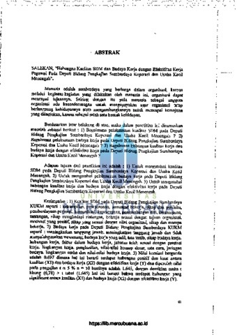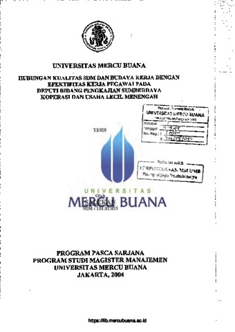 SALEKAN, SALEKAN (2004) HUBUNGAN KUALITAS SDM DAN BUDAYA KERJA DENGAN EFEKTIFITAS KERJA PEGAWAI PADA DEPUTI BIDANG PENGKAJIAN SUMBERDAYA KOPERASI DAN USAHA LECIL MENENGAH. S2 thesis, Universitas Mercu Buana Jakarta.