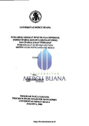 THOLIB, ABDULLAH (2004) PENGARUH TINGKAT SUKU BUNGA DEPOSITO INDEKS HARGA SAHAM GABUNGAN (IHSG) DAN HARGA EMAS TERHADAP PERGERAKAN KURS RP/USD PADA SISTEM KURS MENGAMBANG BEBAS. S2 thesis, Universitas Mercu Buana Jakarta.