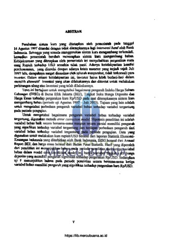 Perubahan sistem kurs yang ditetapkan oleh pemerintah pada tanggal 14 Agustus 1997 ditandai dengan tidak ditetapkannya lagi intervensi band oleh Bank Indonesia. Sehingga yang semula menggunakan sistem kurs mengambang terkendali, kemudian pemerintah berubah menerapkan sistem kurs mengambang bebas. Kebijaksanaan yang ditetapkan oleh pemerintah ini menyebabkan pergerakan mata uang Rupiah terhadap USD semakin tidak pasti. Adanya ketidakpastian kondisi perekonomian, yang ditandai dengan adanya krisis moneter yang terjadi sejak Juli 1997 lalu, dampaknya sangat dirasakan oleh seluruh masyarakat, tidak terkecuali para investor. Dalam situasi ketidakpastian ini, investor harus lebih berhati-hati dalam memilih alternatif investasi yang akan dilakukannya dan dituntut untuk melakukan perhitungan ulang atas investasi yang telah dilakukannya. Tesis ini bertujuan untuk mengetahui bagaimana pengaruh Indeks Harga Saham Gabungan (IHSG) di Bursa Efek Jakarta (BEJ), Tingkat Suku Bunga Deposito dan Harga Emas terhadap pergerakan kurs Rp/USD pada saat diterapkannya sistem kurs mengambang bebas (periode uji Agustus 1997 Juli 2003). Tujuan yang lain adalah untuk mengetahui perbedaan pengaruh variabel bebas terhadap variabel tergantung pada periode pengujian. Untuk mengetahui bagaimana pengaruh variabel bebas terhadap variabel tergantung, digunakan metode error correction model. Hipotesis penelitian ini adalah variabel bebas baik secara bersama-sama maupun secara parsial memiliki pengaruh yang signifikan terhadap variabel tergantung dan terdapat perbedaan pengaruh dari variabel bebas terhadap variabel tergantung pada periode pengujian. Data yang digunakan untuk melakukan kurs rupiah/USD berasal dari laporan Statistik Ekonomi-Keuangan Indonesia yang diterbitkan oleh Bank Indonesia, IHSG berasal dari Annual Report BEJ, dan harga emas berasal dari Badan Pusat Statistik. Hasil yang diperoleh dari penelitian ini menunjukkan bahwa pada periode penelitian dari ketiga variabel bebas dalam model error correction model ini, hanya variabel tingkat ting suku bunga deposito yang memiliki pengaruh signifikan terhadap pergerakan Rp/USD. Sedangkan uji F menunjukkan bahwa pada periode penelitian secara bersama-sama ketiga variabel bebas memiliki pengaruh yang signifikan terhadap pergerakan kurs Rp/USD.