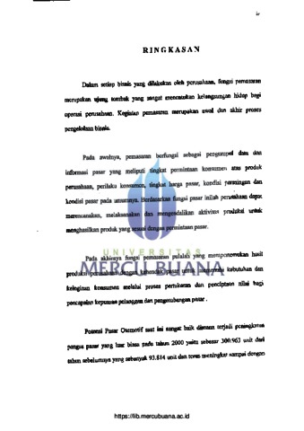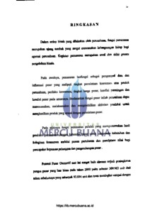Dalam setiap bisnis yang dilakukan oleh perusahaan, fungsi pemasaran merupakan ujung tombak yang sangat menentukan kelangsungan hidup bagi operasi perusahaan. Kegiatan pemasaran merupakan awal dan akhir proses pengelolaan bisnis. Pada awalnya, pemasaran berfungsi sebagai pengumpul data dan informasi pasar yang meliputi tingkat permintaan konsumen atas produk perusahaan, perilaku konsumen, tingkat harga pasar, kondisi persaingan dan kondisi pasar pada umumnya. Berdasarkan fungsi pasar inilah perusahaan dapat merencanakan, melaksanakan dan mengendalikan aktivitas produksi untuk menghasilkan produk yang sesuai dengan permintaan pasar. UNIVER Pada akhirnya fungsi pemasaran pulalah yang mempertemukan hasil MERCI BUANA produksi perusahaan dengan kehendak pasar untuk memenuhi kebutuhan dan keinginan konsumen melalui proses pertukaran dan penciptaan nilai bagi pencapaian kepuasan pelanggan dan pengembangan pasar. Potensi Pasar Otomotif saat ini sangat baik dimana terjadi peningkatan pangsa pasar yang luar biasa pada tahun 2000 yaitu sebesar 300.963 unit dari tahun sebelumnya yang sebanyak 93.814 unit dan terus meningkat sampai dengan tahun 2002 (317.728 unit) walaupun tidak terlalu besar. Saat ini otomotif di Indonesia sedang menggairahkan, namun ramalan trend pertumbuhan pasar otomotif di Indonesia tahun 2003 dan 2004 menurun. PT. INDOMOBIL merupakan satu kelompok usaha otomotif yang terbesar di Indonesia dengan focus usaha dibidang ritel, pelayanan dan pembiayaan kendaraan bermotor. Perseroan dan anak perusahaan merupakan Agen Tunggal Pemegang Merek (ATPM) dan atau distributor dari sembilan merk mobil terkenal, yaitu; Audi, Hino, Mazda, Nissan, Renault, Suzuki, Volkswagen dan Volvo dengan ragam produk kendaraan roda empat dan dua, kendaraan serbaguna, truk dan bis, truk alat berat. Perseroan juga investasi dibeberapa bidang keuangan, teknologi informasi, jasa pengelolaan gedung, perdagangan, penyewaan kendaraan bermotor, suku cadang dan pelayanan purna jual yang terintegrasi. PT. Indomobil bersama dengan manajemen perseroan merupakan pemasok terbesar untuk pasar kendaraan bermotor di Indonesia sejak tahun 1987. keberhasilan ini dicapai berkat adanya strategi yang tepat. Pengetahuan yang mendalam mengenai kebutuhan dan keadaan pasar, serta komitmen yang tinggi MERCU BUANA untuk menciptakan model baru dan pelayanan purna jual. PT. Indomobil juga mengoperasikan pabrik yang besar untuk perakitan kendaraan, pabrik press untuk badan kendaraan, pabrik pengecoran untuk rangka mesin dan pembuatan power train. Produksi PT. Indomobil yang dipasarkan dan menjadi andalan kendaraan Suzuki. Berbagai type suzuki dikeluarkan untuk memenuhi berbagai segmen pasar seperti; AERIO, GRAND ESCUDO XL, DRAND ESCUDO, BALENO MASK, GRAND VITARA, KARIMUN, KATANA, CARRY 1.0 PIC UP CARRY 1.0 MINIBUS, CARRY 1.45 PICK UP, CARRY 1.5 MINIBUS. Mobil suzuki yang dirancang khusus untuk memenuhi pasar Indonesia, memiliki kapasitas tempat duduk yang relatif lebih banyak, kekuatan dan road clearance yang tinggi serta pemeliharaan yang relatif mudah. Penjualan dalam negeri selama ini didukung oleh program pengembangan yang dilakukan secara terus menerus dimana hasil dari program ini adalah penyempurnaan dan penciptaan model baru. Di dalam memasarkan produknya di Indonesia. PT. Indomobil didukung oleh Main Dealers yang tersebar di seluruh pelosok di Indonesia. Pangsa pasar PT. Indomobil terus mengalami peningkatan. Posisi pangsa pasar ini merupakan pencerminan dari peningkatan jaringan distribusi, pelayanan purna jual yang menyeluruh dan rentang produk yang beragam. ப MERCU BUANA Strategi Bersaing PT. INDOMOBIL dalam memasarkan produk adalah strategi pemasaran modern, yaitu strategi kombinasi antara produk, harga, penempatan, promosi, publisitas, niat baik perusahaan dan pelayanan. Dalam hal Strategic Thrust PT. Indomobil memilih strategi differentiation dengan alasan karena produk PT. Indomobil berkualitas.
