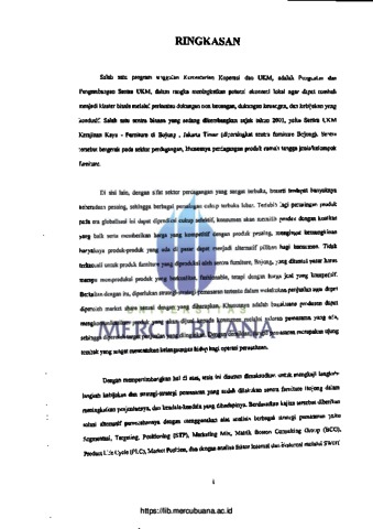 Salah satu program unggulan Kementerian Koperasi dan UKM, adalah Penguatan dan Pengembangan Sentra UKM, dalam rangka meningkatkan potensi ekonomi lokal agar dapat tumbuh menjadi klaster bisnis melalui perkuatan dukungan non keuangan, dukungan keuangan, dan kebijakan yang kondusif. Salah satu sentra binaan yang sedang dikembangkan sejak tahun 2001, yaitu Sentra UKM Kerajinan Kayu Furniture di Bojong Jakarta Timur (dipersingkat sentra furniture Bojong). Sentra tersebut bergerak pada sektor perdagangan, khususnya perdagangan produk rumah tangga jenis/kelompok furniture. Di sisi lain, dengan sifat sektor perdagangan yang sangat terbuka, berarti terdapat banyaknya keberadaan pesaing, sehingga berbagai persaingan cukup terbuka lehar. Terlebih lagi persaingan produk pada eru globalisasi ini dapat diprediksi cukup selektif, konsumen akan memilih produk dengan kualitas yang baik serta memberikan harga yang kompetitif dengan produk pesaing, mengingat kemungkinan banyaknya produk-produk yang ada di pasar dapat menjadi alternatif pilihan bagi konsumen. Tidak terkecuali untuk produk furniture yang diproduksi oleh sentra furniture, Bojong, yang dituntut pasar harus mampu memproduksi produk yang berkualitas, fashionable, tetapi dengan harga jual yang kompetitif. Berkaitan dengan itu, diperlukan strategi-strategi pemasaran tertentu dalam melakukan penjualan agar dapat diperoleh market share sesuai dengan yang diharapkan. Khususnya adalah bagaimana produsen dapat mengkomunikasikan produk yang akan dijual kepada konsumen melalsi saluran pemasaran yang ada, sehingga diperoleh target penjualan yang diinginkan. Dengan demildan, fungsi pemasaran merupakan ujung MERCO BUANA tombak yang sangat menentukan kelangsungan hidup bagi operasi perusahaan. Dengan mempertimbangkan hal di atas, tesis ini disusun dimaksudkan untuk mengkaji langkah-langkah kebijakan dan strategi-strategi pemasaran yang sudah dilakukan sentra furniture Bojong dalam meningkatkan penjualannya, dan kendala-kendala yang dihadapinya. Berdasarkan kajian tersebut diberikan solusi alternatif pemecahannya dengan menggunakan alat analisis berbagai strategi pemasaran yaitu Segmentasi, Targeting, Positioning (STP), Marketing Mix, Matrik Boston Consulting Group (BCG), Product Life Cycle (PLC), Market Position, dan dengan analisa faktor internal dan eksternal melalui SWOT amansis diperoleh hasil sentra furniture Bojong belum mampu meningkatkan volume penjualannya, sehingga peningkatan market share akan sulit tercapai. Hal tersebut dikarenakan posisi sentra Bojong berdasarkan analisis matrik BCG pada posisi anjing, sehingga sangat mengkhawatirkan, posisi produk pada PLC masih dalam tahap pengenalan, sehingga untuk pengembangannya dibutuhkan investasi yang cukup besar. Terlebih lagi penjualan produknya masih belum berorientasi pada konsumen pemakai langsung. Hal tersebut terlihat dari perbandingan penjualannya dimana 70% produk dijual kepada konsumen penjual kembali, dan 30% yang dijual kepada konsumen pemakai langsung, sehingga produk yang dijual lebih banyak barang setengah jadi (belum difinishing). Berarti para pengrajin juga belum berorientasi pada mutu produk, mengingat kontrol akhir lebih banyak tergantung pada konsumen penjual kembali yang melakukan penyelesaian akhir produk. Di sisi lain, juga diperoleh analisa bahwa para pengrajin pada sentra tersebut belum berorientasi pada strategi design produk tertentu, untuk membedakan dengar pesaing pada posisi ceruk pasar yang hanya sekitar 5%. Sebagai solusi pemecahannya, ditempuh beberapa alternatif langkah kebijakan dan strategi pemasaran pada sentra furniture Bojong guna meningkatkan penjualannya sekaligus meningkatkan market share-nya dengan mempertimbangkan keterbatasan sumberdaya yang adı, dan memperhatikan kekuatan yang dimiliki, efektifitas pencapaian sasaran, dan dapat diaplikasikan, yaitu 1.Dalam rangka mempertahankan kepercayaan konsumen yang telah dimiliki dan menarik konsumen yang loyal terhadap mutu, maka perlu dilakukan terus menerus perbaikan mutu dan menjaga kualitas mutu, yang selama ini belum dilakukan secara optimal. Seperti dengan MERCU BUANA penambahan peralatan yang standar ater seragam sebagai peralatan produksi pengrajin di sentra, dan penjualan sampai finishing produksi sehingga kualitas produk akhir dapat terkontrol sesuai standar yang diharapkan. 2.Dalam posisi sekarang sebaiknya strategi penetration pricing tetap dipertahankan, guna merebut segmentasi pasar pesaing, khususnya pada konsumen dengan perilaku sensitif terhadap harga yang murah dengan kualitas yang setara, khususnya untuk target jangka pendek merebut pasar pesaing pada pasar yang di wilayah 5%. 3. Sejalan dengan rencana peningkatan penjualan, perlu dilakukan perbaikan produksi, kualitas, dan design (disarankan dengan ciri khas khusus, misal ciri khas Betawi). Berkaitan dengan itu, perlu diperluas jaringan distribusi yang sudah ada, dengan menumbuhkan outlet-outlet baru agar tertarik menjual produk sentra furniture Bojong (contoh salah satu strategi dengan pemberian diskon, sampel), sehingga lebih mendekatkan produk sentra kepada konsumen. Dengan demikian, diharapkan penjualan langsung kepada konsumen pemakai langsung akan lebih tinggi persentasenya, dibandingkan dengan penjualan kepada konsumen penjual kembali, sehingga nilai tambah lebih besar dinikmati pengrajin sentra (pola lama 30%; 70%, diharapkan 70%; 30%). Akan lebih baik lagi apabila dibangun ruang pamer pemasaran bersama anggota sentra (tidak perlu mahal tapi diutamakan terlebih dahulu fungsinya). 4. Manfaatkan dengan baik program pemerintah untuk pengembangan sentra UKM, dengan menugaskan pengurus koperasi melakukan koordinasi aktif ke lembaga pembina seperti Kementerian Koperasi dan UKM, Deperindag, dan instansi/lembaga terkait lainnya. 5. Dalam rangka meningkatkan pemasaran produk perlu dipikirkan pada perluasan pasar secara bertahap di luar Pasar Klender, Jakarta Timur, seperti pasar lain di wilayah JABOTABEK. Namun demikian, sejalan dengan perluasan pa