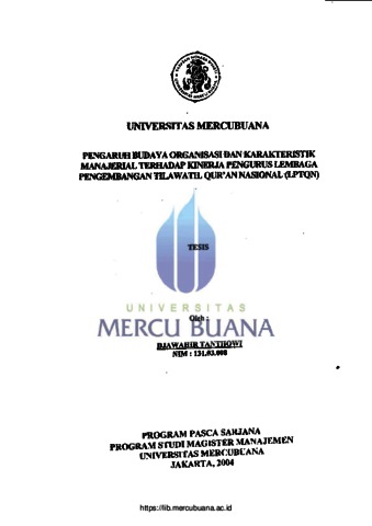 TANTHOWI, DJAWAHIR (2004) PENGARUH BUDAYA ORGANISASI DAN KARAKTERISTIK MANAJERIAL TERHADAP KINERJA PENGURUS LEMBAGA PENGEMBANGAN TILAWATIL QUR'AN NASIONAL (LPTQN). S2 thesis, Universitas Mercu Buana Jakarta.