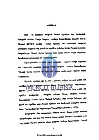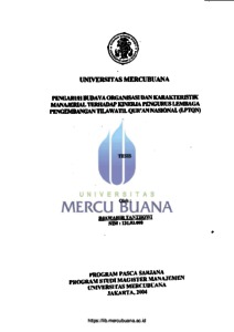 Tesis ini membahas Pengaruh Budaya Organisasi dan Karakteristik Manajerial terhadap Kinerja Pengurus Lembaga Pengembangan Tilawatil Qur'an. Nasional (LPTQN). Apakah budaya organisasi dan karakteristik manajerial mempunyai pengaruh yang positif dan signifikan terhadap kinerja Pengurus Lembaga Pengembangan Tilawatil Qur'an Nasional. Jelas kinerja tersebut sangat bergantung kepada manajerial yang baik dan budaya yang positif. Tujuan penelitian ini adalah untuk mengetahui pengaruh budaya organisasi dan karakteristik manajerial terhadap kinerja Pengurus Lembaga Pengembangan Tilawatil Qur'an Nasional (LPTQN) baik secara sendiri-sendiri bersama-sama. maupun secaга Hipotesis penelitian ada 3, yaitu pertama terdapat pengaruh positif dan SITAS signifikan, budaya organisasi terhadap kinerja Pengurus Lembaga Pengembangan MERCU BUANA Tilawatil Qur'an Nasional (LPTON), kedua terdapat pengaruh yang positif dan signifikan. Karakteristik manajerial terhadap kinerja Pengurus Lembaga Pengembangan Tilawatil Qur'an Nasional (LPTQN), ketiga terdapat hubungan yang positif dan signifikan antara budaya organisasi dan karakteristik manajerial terhadap kinerja Pengurus Lembaga Pengembangan Tilawatil Qur'an Nasional (LPTQN). Pengumpulan data menggunakan methode survei, dimana peneliti berusaha menghubungkan satu atau lebih variable dengan variable lain untuk memahami objek yang diteliti. Populasi penelitian adalah pengurus Lembaga Pengembangan Tilawatil Qur'an Nasional periode 2002 2005 yang berjumlah 62 orang, namun yang dijadikan sample sebanyak 35 orang. Pengumpulan data dilakukan dengan kuesioner, data yang diperoleh dianalisis secara deskriptif dan kuantitatif (statistik). Hasil analisis deskriptif menunjukkan bahwa secara umum budaya organisasi dan karakteristik manajerial mempunyai pengaruh terhadap kinerja Pengurus Lembaga Pengembangan Tilawatil Qur'an Nasional (LPTON), sedangkan dari analisis statistik menunjukkan: 1. Budaya organisasi berpengaruh positif dan signifikan terhadap kinerja Pengurus Lembaga Pengembangan Tilawatil Qur'an yang ditunjukkan oleh nilai-nilai t hitung (3,694) lebih besar dibandingkan nilai t table (1,677), nilai koefesien korelasi 0,541, dan nilai koefesien determinasi 0,292 (29,2%). 2. Karakteristik manajerial berpengaruh positif dan signifikan terhadap kinerja Pengurus Lembaga Pengembangan Tilawatil Qur'an Nasional yang ditunjukkan RSITAS oleh nilai 1 hitung (4,731) lebih besar dibandingkan dari nilai t table (1,677), nilai MERCU BUANA koefesien korelasi 0,636, dan nilai koefesten determinası 0,404 (40,4%). 3. Pengaruh budaya organisasi dan karakteristik manajerial secara bersama-sama positif dan signifikan terhadap kinerja Pengurus Lembaga Pengembangan Tilawatil Qur'an Nasional yang ditunjukkan oleh nilai f hitung (13,493) lebih besar dibandingkan nilai t table (3,30), nilai koefesien korelasi 0,676 dan nilai koefesien determinasi 0,458 (45,8%).