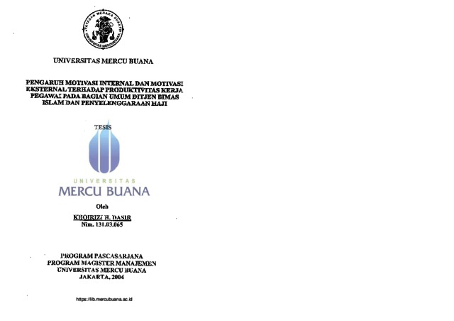 DASIR, KHOIRIZI H (2004) PENGARUH MOTIVASI INTERNAL DAN MOTIVASI EKSTERNAL TERHADAP PRODUKTIVITAS KERJA PEGAWAI PADA BAGIAN UMUM DITJEN BIMAS ISLAM DAN PENYELENGGARAAN HAJI. S2 thesis, Universitas Mercu Buana Jakarta.