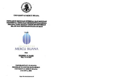Pencapaian tujuan organisasi dipengaruhi oleh tantangan organisasi internal dan eksternal. Tantangan internal organisasi dapat berupa perubahan teknologi, perubahan pegawai dan perubahan pengembangan. Tantangan eksternal biasanya berupa perubahan ekonomi, perubahan kebijaksanaan, ketatnya persaingan. Tantangan organisasi dapat mempersulit tercapainya proses tujuan organisasi. Sukses tidaknya pengelolaan organisasi tergantung pada keadaan sumber daya manusia yang ada didalamnya terutama mengenai kecakapan, keinginan anggota, pekerjaannya, inspirasinya, serta kepercayaan anggota untuk mencapai sasaran. Dengan demikian pengembangan sumber daya manusia Jalam satu organisasi mutlak diperlukan. Tanpa sumber daya manusia yang berkualitas, tujuan organisasi tidak akan terwujud. Berdasarkan uraian latar belakang masalah di atas, maka masalah penelitian ini dapat dirumuskan sebagai berikut: 1) Apakah terdapat pengaruh motivasi internal terhadap produktivitas kerja pada Bagian Umum Ditjen Bimas Islam dan Penyelenggaraan Haji? 2) Apakah terdapat pengaruh motivasi eksternal terhadap produktivitas kerja pada Bagian Umum Ditjen Bimas Islam dan Penyelenggaraan Haji ? 3) Apakah terdapat pengaruh antara motivasi internal dan motivasi eksternal terhadap produktivitas kerja pegawai pada Bagian Umum Ditjen Bimas Islam dan Penyelenggaraan Haji? Adapun tujuan penulisan ini adalah: 1) Untuk mengetahui pengaruh motivasi internal terhadap produktivitas kerja pada Bagian Umum Ditjen Bimas Islam dan Penyelenggaman Haji. 2) Untuk mengetahui pengaruh motivasi eksternal terhadap produktivitas kerja pada Bagian Umum Ditjen Bimas Islam dan Penyelenggaraan Haji. 3) Untuk mengetahui pengaruh motivasi internal dan motivasi eksternal terhadap produktivitas kerja pada Bagian Umum Ditjen Bimas Islam dan Penyelenggaraan Haji. Kesimpulan: 1) Ditjen Bimas Islam dan Penyelenggaraan Haji, memberikan motivasi internal kepada pegawainya antara lain penghargaan, jaminan kesehatan, bonus tahunan, meningkatkan konsilidasi antara atasan dan bawahan, sanksi/peraturan kerja, fasilitas-fasilitas, pensiun. Sehingga dengan diberikannya motivasi tersebut maka produktivitas kerja pegawai akan meningkat. 2) Pelaksanaan Motivasi Eksternal yang dilakukan Bagian Umum Ditjen Bimas Islam dan Penyelenggaraan Haji antara lain dengan diberikannya gaji/upah pokok, macam-macam tunjangan, menyelenggarakan pendidikan dan pelatihan bagi pegawai, mengadakan promosi kepada pegawai. 3) Pada pengujian hipotesis, maka variabel XI (motivasi internal) dan variabel X2 (motivasi eksternal) berpengaruh nyata terhadap produktivitas kerja karena t hitung-nya > t tabel, hasil F hitung diperoleh nilai yang lebih besar daripada F tabel maka Ho ditolak dan H, diterima yang berarti bahwa terdapat pengaruh secara bersama-sama antara variabel X1 (motivasi internal) dan varibel X2 (motivasi eksternal) terhadap produktivitas kerja.