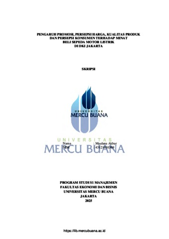 AKBAR, MAULANA (2025) PENGARUH PROMOSI, PERSEPSI HARGA, KUALITAS PRODUK DAN PERSEPSI KONSUMEN TERHADAP MINAT BELI SEPEDA MOTOR LISTRIK DI DKI JAKARTA. S1 thesis, Universitas Mercu Buana Jakarta.