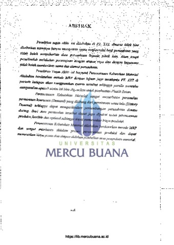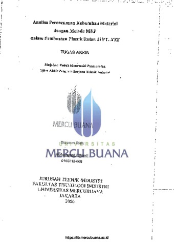 EFFENDI, MOHAMMAD (2006) ANALISA PERENCANAAN KEBUTUHAN MATERIAL DENGAN METODE MRP DALAM PEMBUATAN PLASTIK ROTAN DI PT. XYZ. S1 thesis, Universitas Mercu Buana Jakarta.