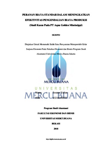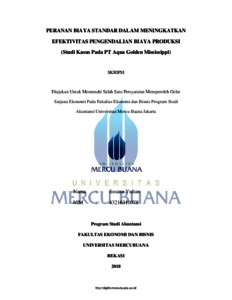 YULIAN, SUSANA (2018) PERANAN BIAYA STANDAR DALAM MENINGKATKAN EFEKTIVITAS PENGENDALIAN BIAYA PRODUKSI (Studi Kasus Pada PT Aqua Golden Mississippi). S1 thesis, UNIVERISTAS MERCU BUANA - BUNCIT.