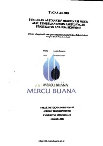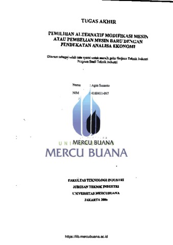 SUSANTO, AGUS (2006) PEMILIHAN ALTERNATIF MODIFIKASI MESIN ATAU PEMBELIAN MESIN BARU DENGAN PENDEKATAN ANALISA EKONOMI. S1 thesis, Universitas Mercu Buana Jakarta.