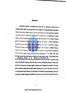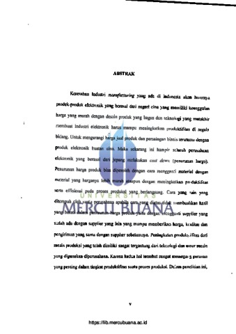 Keresahan Industri manufacturing yang ada di indonesia akan haıdırnya produk-produk elektronik yang berasal dari negeri cina yang memiliki keunggulan harga yang murah dengan desain produk yang bagus dan teknologi yang mutakhir membuat industri elektronik harus mampu meningkatkan produktifitas di segala bidang. Untuk mengurangi harga jual produk dan persaingan bisnis terutama dengan produk elektronik buatan cina. Maka sekarang ini hampir seluruh perusahaan elektronik yang berasal dari jepang melakukan cost down (penurunan harga). Penurunan harga produk bisa diperoleh dengan cara mengganti material dengan material yang harganya lebih murah ataupun dengan meningkatkan produktifitas serta effisiensi pada proses pada proses produksi yang berlangsung. Cara yang lain yang UNIVER ERSITAS ditempuh oleh suatu perusahaan apabila cara yang diatas tidak membualıkan hasil MERCIL BUANA yang berati dalam penurunan harga produk yaitu dengan mengganti supplier yang sudah ada dengan supplier yang lain yang mampu memberikan harga, kualitas dan pengiriman yang sama dengan supplier sebelumnya. Peningkatan produks ifitas dari mesin produksi yang telah dimiliki sangat tergantung dari teknologi dan umur mesin yang digunakan diperusahaan. Karena kedua hal tersebut sangat memegar g peranan yang penting dalam tingkat produktifitas suatu proses produksi. Dalam penelitian ini, penulis mencoba untuk melakukan analisa keekonomian terhadap alternatif yang haus diambil oleh Top Management dalam meningkatkan produktifitas mesin Dipping Solder. Alterntif yang ditawarkan adalah membeli unit mesin baru dan memodifikasi mesin yang telah ada. Dari kedua pilihan tersebut ternyata modifikasi mesin lebih banyak memberikan keuntungan bagi perusahaan. Hal ini didukung juga oleh hasil analisa keekonomian yang telah dihitung dan menunjukan bahwa nilai yang diperoleh untuk modifikasi mesin jauh lebih tinggi dari pada membeli mesin yang baru.