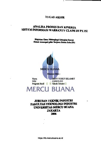 SELAMET, DENNY YUSUF (2006) ANALISA PROSES DAN KINERJA SISTEM INFORMASI WARRANTY CLAIM DI PT.ISI. S1 thesis, Universitas Mercu Buana Jakarta.