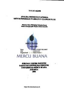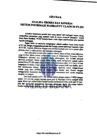 ANALISA PROSES DAN KINERJA SISTEM INFORMASI WARRANTY CLAIM DI PT.ISI Semakin banyaknya produk baru yang masuk dari berbagai negara asing, menjadikan persaingan yang semakin ketat di dunia otomotif Indonesia. Untuk tetap dapat bertahan, PT.ISI bekerja keras untuk dapat memberikan nilai tambah kepada pelanggan. Tugas Akhir ini mencoba mengangkat sebuah analisis kasus yang terjadi di PT.ISI, dengan menganalisa proses dan kinerja sistem informasi warranty claim di PT.ISI. Analisis dilakukan dengan cara melihat kembali peta aliran proses (flow process chart), waktu proses, dan kepuasan pelanggan. Dari peta aliran proses (flow process chart), dapat terlihat semua aktivitas, yang terlibat dalam proses pelaksanaan kerja di Departemen Warranty Claim. Diharapkan aktivitas non produktif dapat dihilangkan, dan diubah menjadi aktivitas produktif. Waktu proses klaim diukur untuk mengetahui apakah waktu proses klaim PT.ISI sudah sesuai dengan moto sistemnya yakni 10-3-3-6, (10 hari pengerjaan di dealer, 3 hari proses di PT.ISI, 3 hari umpan balik dari dealer, dan 6 hari pembayaran klaim). Kepuasan pelanggan disurvey untuk mengevaluasi sistem yang baru (NWRS), di tingkat Main Dealer atau Dealer dengan menggunakan Kuesioner dan juga melakukan wawancara baik secara langsung maupun via telepon. Dari hasil analisis di PT. ISI, terlihat bahwa dengan adanya NWRS dengan sistem 10-3-3-6 ini, proses layanan purna jual di Warranty Claim menjadi lebih cepat. Mulai dari proses klaim sampai proses pembayaran tidak lebih dari 22 hari. Dan dari hasil dari pengukuran kepuasan pelanggan dapat dinyatakan bahwa Dealer merasa sangat puas atas kinerja sistem yang baru (NWRS).