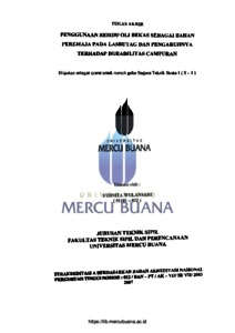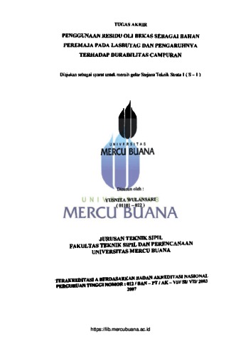 WULANSARI, YUSNITA (2007) PENGGUNAAN RESIDU OLI BEKAS SEBAGAI BAHAN PEREMAJA PADA LASBUTAG DAN PENGARUHNYA TERHADAP DURABILITAS CAMPURAN. S1 thesis, Universitas Mercu Buana Jakarta.