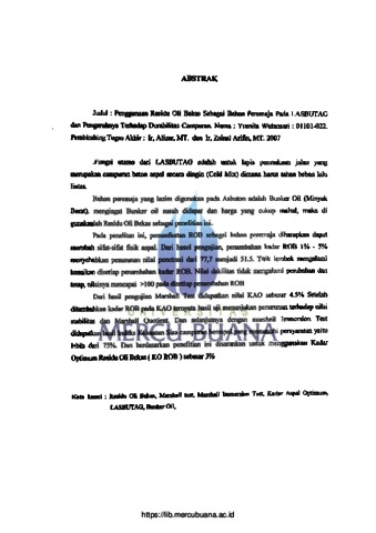 Fungsi utama dari LASBUTAG adalah untuk lapis permukaan jalan yang merupakan campuran beton aspal secara dingin (Cold Mix) dimana harus tahan beban lalu lintas. Bahan peremaja yang lazim digunakan pada Asbuton adalah Bunker Oil (Minyak Berat), mengingat Bunker oil susah didapat dan harga yang cukup mahal, maka di gunakanlah Residu Oli Bekas sebagai penelitian ini. Pada penelitan ini, pemanfaatan ROB sebagai bahan peremaja diharapkan dapat merubah sifat-sifat fisik aspal. Dari hasol pengujian, penambahan kadar ROB 1%-5% menyebabkan penurunan nilai penetrasi dari 77,7 menjadi 51.5. Titik lembek mengalami kenaikan disetiap penambahan kadar ROB. Nilai dakilitas tidak mengalami perubahan dan tetap, nilainya mencapai >100 pada disetiap penambahan ROB Dari hasil pengujian Marshall Test didapatkan nilai KAO sebesar 4.5% Setelah ditambahkan kadar ROB pada KAO ternyata hasil uji menunjukan penurunan terhadap nilai stabilitas dan Marshall Quotient. Dan selanjutnya dengan marshall Immersion Test didapatkan hasil Indeks Kekuntan Sisa campuran beraspal yang menatuahi persyaratan yaitu lebih dari 75%. Dan berdasarkan penelitian ini disarankan untuk menggunakan Kadar Optimum Residu Oli Bekas (KO ROB) sebesar 3% -MEKEL BLANA Kata kunci: Residu Oli Bekas, Marshall test, Marshall Immersion Test, Kadar Aspal Optimum, LASBUTAG, Bunker Oil,