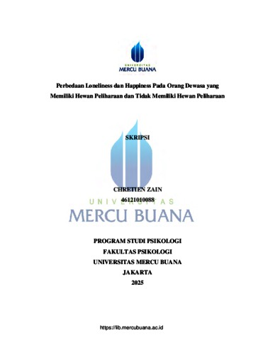 ZAIN, CHRETIEN (2025) PERBEDAAN LONELINESS DAN HAPPINESS PADA ORANG DEWASA YANG MEMILIKI HEWAN PELIHARAAN DAN TIDAK MEMILIKI HEWAN PELIHARAAN. S1 thesis, Universitas Mercu Buana Jakarta.