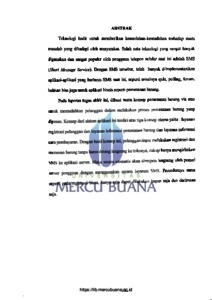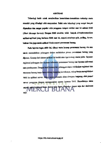 Teknologi hadir untuk memberikan kemudahan-kemudahan terhadap suatu masalah yang dihadapi oleh masyarakat. Salah satu teknologi yang sangat banyak digunakan dan sangat populer oleh pengguna telepon selular saat ini adalah SMS (Short Message Service). Dengan SMS tersebut, telah banyak diimplementasikan aplikasi-aplikasi yang berbasis SMS saat ini, seperti misalnya quis, polling, forum, bahkan bisa juga untuk aplikasi bisnis seperti pemesanan barang. Pada laporan tugas akhir ini, dibuat suatu konsep pemesanan barang via sms untuk memudahkan pelanggan dalam melakukan proses pemesanan barang yang dipesan. Konsep dari sistem aplikasi ini terdiri atas tiga konsep utama yaitu: layanan registrasi pelanggan dan layanan informasi pemesanan barang dan layanan informasi cara pembayaran. Dengan hasil konsep ini, pelanggan dapat melakukan registrasi dan memesan barang tanpa harus datang langsung ke tokonya, cukup hanya mengirimkan SMS ke aplikasi server. Maka secara otomatis akan direspon langsung oleh ponsel layanan SMS. Prosedurnya sama server pengguna dengan menggunakan sarana N TAS seperti pada registrasi biasa, hanya saja dapat dilakukan kapan saja dan darimana saja. S MERCU BUANA