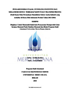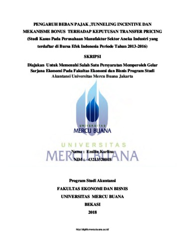 KARLINA, EMILIA (2018) PENGARUH BEBAN PAJAK ,TUNNELING INCENTIVE DAN MEKANISME BONUS TERHADAP KEPUTUSAN TRANSFER PRICING (Studi Kasus Pada Perusahaan Manufaktur Sektor Aneka Industri yang terdaftar di Bursa Efek Indonesia Periode Tahun 2013-2016). S1 thesis, UNIVERISTAS MERCU BUANA - BUNCIT.