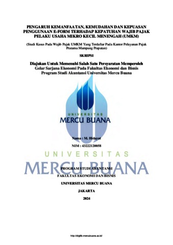 M.HIDAYAT, M.HIDAYAT (2024) PENGARUH KEMANFAATAN, KEMUDAHAN DAN KEPUASAN PENGGUNAAN E-FORM TERHADAP KEPATUHAN WAJIB PAJAK PELAKU USAHA MIKRO KECIL MENENGAH (UMKM) (STUDI KASUS PADA WAJIB PAJAK UMKM YANG TERDAFTAR PADA KANTOR PELAYANAN PAJAK PRATAMA MAMPANG PRAPATAN). S1 thesis, UNIVERSITAS MERCU BUANA - BUNCIT.