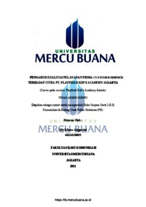 ANGGRAINI, SITI IRLIANA (2021) PENGARUH KUALITAS PELAYANAN PRIMA CUSTOMER SERVICE TERHADAP CITRA PT. PLAYFIELD KID'S ACADEMY JAKARTA (Survei pada member Playfield Kid's Academy Jakarta). S1 thesis, Universitas Mercu Buana Jakarta.