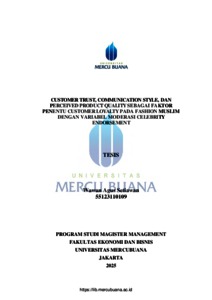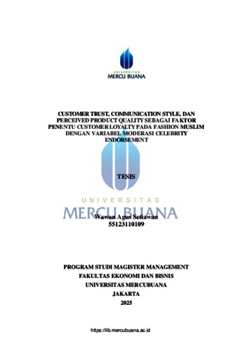 SETIAWAN, WAWAN AGUS (2025) CUSTOMER TRUST, COMMUNICATION STYLE, DAN PERCEIVED PRODUCT QUALITY SEBAGAI FAKTOR PENENTU CUSTOMER LOYALTY PADA FASHION MUSLIM DENGAN VARIABEL MODERASI CELEBRITY ENDORSEMENT. S2 thesis, Universitas Mercu Buana Jakarta.