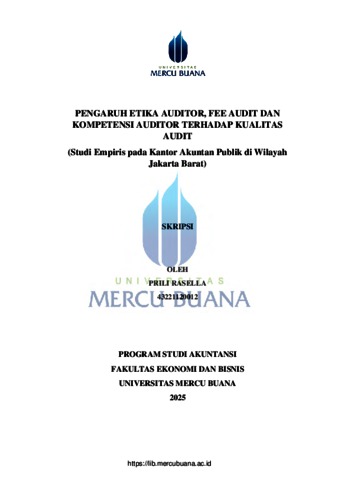 RASELLA, PRILI (2025) PENGARUH ETIKA AUDITOR, FEE AUDIT DAN KOMPETENSI AUDITOR TERHADAP KUALITAS AUDIT (Studi Empiris pada Kantor Akuntan Publik di Wilayah Jakarta Barat). S1 thesis, Universitas Mercu Buana Jakarta.