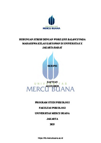 DAFIYAN, DAFIYAN (2025) HUBUNGAN STRESS DENGAN WORK LIFE BALANCE PADA MAHASISWA KELAS KARYAWAN DI UNIVERSITAS X JAKARTA BARAT. S1 thesis, Universitas Mercu Buana Jakarta.