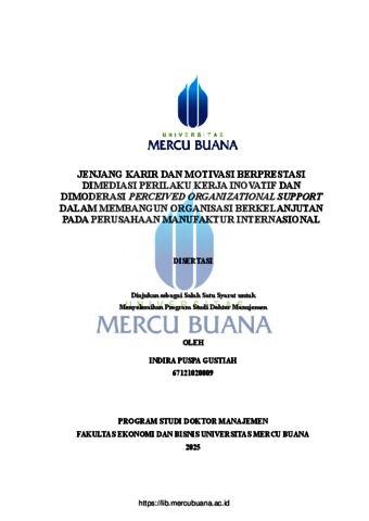 GUSTIAH, INDIRA PUSPA (2025) JENJANG KARIR DAN MOTIVASI BERPRESTASI DIMEDIASI PERILAKU KERJA INOVATIF DAN DIMODERASI PERCEIVED ORGANIZATIONAL SUPPORT DALAM MEMBANGUN ORGANISASI BERKELANJUTAN PADA PERUSAHAAN MANUFAKTUR INTERNASIONAL. S3 thesis, Universitas Mercu Buana Jakarta.