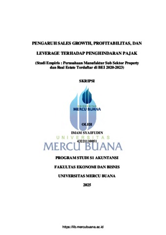 SYAIFUDIN, IMAM (2025) PENGARUH SALES GROWTH, PROFITABILITAS, DAN LEVERAGE TERHADAP PENGHINDARAN PAJAK (Studi Empiris : Perusahaan Manufaktur Sub Sektor Property dan Real Estate Terdaftar di BEI 2020-2023). S1 thesis, Universitas Mercu Buana Jakarta.
