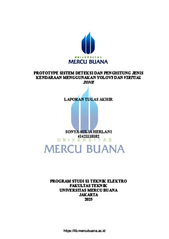 Traffic congestion in urban areas, particularly in Jakarta, has become a critical issue that demands innovative technological solutions. This undergraduate thesis presents the development of a prototype system for real-time vehicle type detection and counting using the YOLOv3 algorithm combined with the Virtual Zone method. The system is designed to identify four categories of vehicles— motorcycles, cars, trucks, and buses—and count them only when they cross a predefined virtual area, thereby minimizing duplicate counting and increasing detection reliability. To evaluate the performance of the system, three datasets were utilized: KITTI, GRAM-RTM, and COCO. These datasets were chosen for their diverse characteristics and relevance to traffic scenarios. The results demonstrate that the YOLOv3 algorithm is capable of achieving high performance in both detection and classification, with precision, recall, and F1-score all reaching a perfect score of 1.0. The implementation of the Virtual Zone further ensures accurate vehicle counting by filtering detections based on spatial constraints. Field implementation demonstrated that the system could reliably detect vehicles with an average precision of 0.803 for motorcycles, 0.892 for cars, 0.777 for trucks, and 1.00 for buses, while recall values reached 1.00 in some classes, with the lowest recorded at 0.67 for trucks. The mean Average Precision (mAP) improved across three test videos, from 0.6125 in the first video, 0.8275 in the second, to 0.885 in the third. In terms of speed, the system operated in real time with an average of 23–25 frames per second (fps) and an inference time of approximately 0.04 seconds per frame, proving its feasibility for practical application in urban traffic monitoring with high accuracy and rapid response. Keywords: YOLOv3, Virtual Zone, Vehicle Detection, Vehicle Counting, Deep Learning, Traffic Monitoring Kemacetan lalu lintas di kawasan perkotaan, khususnya di Jakarta, telah menjadi permasalahan krusial yang memerlukan solusi teknologi yang inovatif. Skripsi ini mengembangkan sebuah prototipe sistem untuk deteksi dan penghitungan jenis kendaraan secara real-time menggunakan algoritma YOLOv3 yang dikombinasikan dengan metode Virtual Zone. Sistem ini dirancang untuk mengenali empat kategori kendaraan—sepeda motor, mobil, truk, dan bus—serta menghitung kendaraan tersebut hanya ketika melintasi area virtual yang telah ditentukan, sehingga dapat meminimalkan perhitungan ganda dan meningkatkan keandalan deteksi. Untuk mengevaluasi kinerja sistem, digunakan tiga jenis dataset, yaitu KITTI, GRAM-RTM, dan COCO. Ketiga dataset tersebut dipilih karena memiliki karakteristik yang beragam dan relevan dengan skenario lalu lintas. Hasil pengujian menunjukkan bahwa algoritma YOLOv3 mampu mencapai performa tinggi dalam proses deteksi dan klasifikasi kendaraan, dengan nilai precision, recall, dan F1- score mencapai angka sempurna sebesar 1.0. Implementasi metode Virtual Zone juga terbukti mampu meningkatkan akurasi penghitungan dengan cara memfilter deteksi berdasarkan batasan spasial. Berdasarkan hasil implementasi lapangan, sistem berhasil mendeteksi kendaraan secara andal dengan rata-rata precision 0.803 untuk motor, 0.892 untuk mobil, 0.777 untuk truk, dan 1.00 untuk bus, sedangkan nilai recall mencapai 1.00 pada beberapa kelas dengan nilai terendah 0.67 pada truk. Evaluasi mAP menunjukkan peningkatan performa dari 0.6125 pada video pertama, 0.8275 pada video kedua, hingga 0.885 pada video ketiga. Dari sisi kecepatan, sistem mampu bekerja secara real-time dengan rata-rata 23–25 frame per second (fps) dan waktu inferensi sekitar 0.04 detik per frame, sehingga dapat diterapkan secara praktis untuk pemantauan lalu lintas perkotaan dengan tingkat akurasi tinggi dan respon cepat. Kata kunci: YOLOv3, Virtual Zone, Deteksi Kendaraan, Penghitungan Kendaraan,Deep Learning, Pemantauan Lalu Lintas