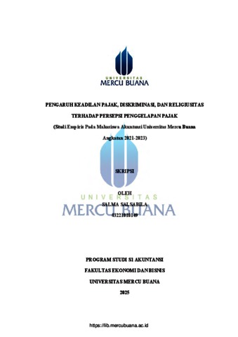 SALSABILA, SALMA (2025) PENGARUH KEADILAN PAJAK, DISKRIMINASI, DAN RELIGIUSITAS TERHADAP PERSEPSI PENGGELAPAN PAJAK (Studi Empiris Pada Mahasiswa Akuntansi Universitas Mercu Buana Angkatan 2021-2023). S1 thesis, Universitas Mercu Buana Jakarta.