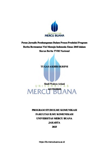 ARIANI, SINDI WAHYU (2025) PERAN JURNALIS PEMBANGUNAN DALAM PROSES PRODUKSI PROGRAM BERITA BERMUATAN VISI MENUJU INDONESIA EMAS 2045 DALAM SIARAN BERITA TVRI NASIONAL. S1 thesis, Universitas Mercu Buana Jakarta.