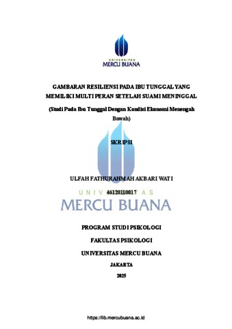 AKBARIWATI, ULFAH FATHURAHMAH (2025) GAMBARAN RESILIENSI PADA IBU TUNGGAL YANG MEMILIKI MULTI PERAN SETELAH SUAMI MENINGGAL (Studi Pada Ibu Tunggal Dengan Kondisi Ekonomi Menengah Bawah). S1 thesis, Universitas Mercu Buana Jakarta.