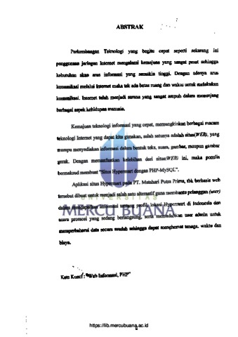 Perkembangan Teknologi yang begitu cepat seperti sekarang ini penggunaan jaringan Internet mengalami kemajuan yang sangat pesat sehingga kebutuhan akan arus informasi yang semakin tinggi. Dengan adanya arus komunikasi melalui Internet maka tak ada batas ruang dan waktu untuk melakukan komunikasi. Internet telah menjadi sarana yang sangat ampuh dalam menunjang berbagai aspek kehidupan manusia. Kemajuan teknologi informasi yang cepat, memungkinkan berbagai macam teknologi Internet yang dapat kita gunakan, salah satunya adalah situs(WEB), yang mampu menyediakan informasi dalam bentuk teks, suara, gambar, maupun gambar gerak. Dengan memanfaatkan kelebihan dari situs(WEB) ini, maka penulis bermaksud membuat "Situs Hypermart dengan PHP-MySQL". Aplikasi situs Hypermart pada PT. Matahari Putra Prima, tbk berbasis web membantu pelanggan (user) tersebut dibuat untuk menjadi salah satu alternatif guna t TAS dalam mendapatkan informasi tentang profil, lokasi Hypermart di Indonesia dan MERCU BUANA acara promosi yang sedang berlangsung, serta memudahkan user admin untuk memperbaharui data secara mudah sehingga dapat menghemat tenaga, waktu dan biaya.