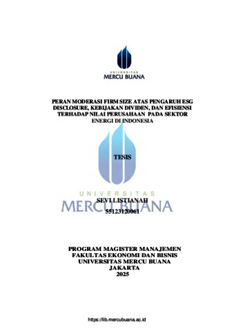 LISTIANAH, SEVI (2025) PERAN MODERASI FIRM SIZE ATAS PENGARUH ESG DISCLOSURE, KEBIJAKAN DIVIDEN, DAN EFISIENSI TERHADAP NILAI PERUSAHAAN PADA SEKTOR ENERGI DI INDONESIA. S2 thesis, Universitas Mercu Buana Jakarta.
