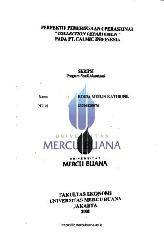 KATHRINE, ROIDA MEILIN (2008) PERSPEKTIF PEMERIKSAAN OPERASIONAL "COLLECTION DEPARTEMEN " PADA PT. CALMIC INDONESIA. S1 thesis, Universitas Mercu Buana Jakarta.
