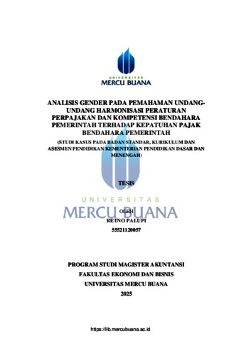 PALUPI, RETNO (2025) ANALISIS GENDER PADA PEMAHAMAN UNDANG-UNDANG HARMONISASI PERATURAN PERPAJAKAN DAN KOMPETENSI BENDAHARA PEMERINTAH TERHADAP KEPATUHAN PAJAK BENDAHARA PEMERINTAH (STUDI KASUS PADA BADAN STANDAR, KURIKULUM DAN ASESMEN PENDIDIKAN KEMENTERIAN PENDIDIKAN DASAR DAN MENENGAH). S2 thesis, Universitas Mercu Buana Jakarta.