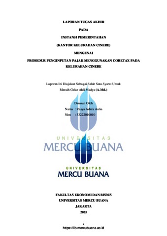AULIA, RASYA ADZRA (2025) LAPORAN TUGAS AKHIR PADA INSTANSI PEMERINTAHAN (KANTOR KELURAHAN CINERE) MENGENAI PROSEDUR PENGINPUTAN PAJAK MENGGUNAKAN CORETAX PADA KELURAHAN CINERE. D3 thesis, Universitas Mercu Buana Jakarta.