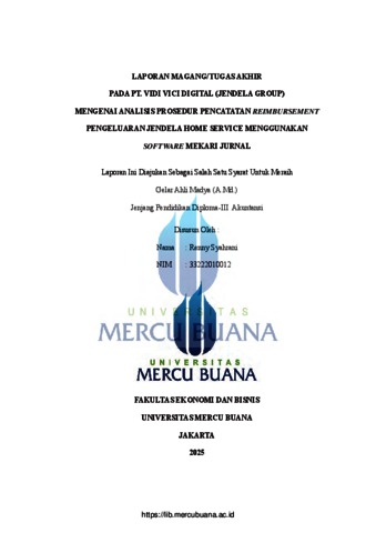 SYAHRANI, RENNY (2025) LAPORAN MAGANG/TUGAS AKHIR PADA PT. VIDI VICI DIGITAL (JENDELA GROUP) MENGENAI ANALISIS PROSEDUR PENCATATAN REIMBURSEMENT PENGELUARAN JENDELA HOME SERVICE MENGGUNAKAN SOFTWARE MEKARI JURNAL. D3 thesis, Universitas Mercu Buana Jakarta.
