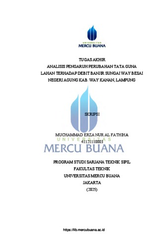 FATHIHA, MUCHAMMAD ERZA NUR AL (2025) ANALISIS PENGARUH PERUBAHAN TATA GUNA LAHAN TERHADAP DEBIT BANJIR SUNGAI WAY BESAI NEGERI AGUNG KAB. WAY KANAN, LAMPUNG. S1 thesis, Universitas Mercu Buana Jakarta.