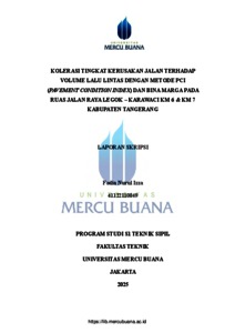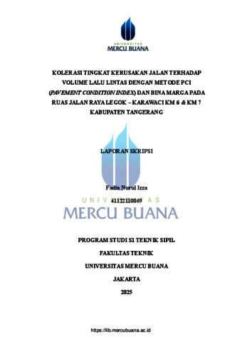 IZZA, FADIA NURUL (2025) KOLERASI TINGKAT KERUSAKAN JALAN TERHADAP VOLUME LALU LINTAS DENGAN METODE PCI (PAVEMENT CONDITION INDEX) DAN BINA MARGA PADA RUAS JALAN RAYA LEGOK - KARAWACI KM 6 & KM 7 KABUPATEN TANGERANG. S1 thesis, Universitas Mercu Buana Jakarta.